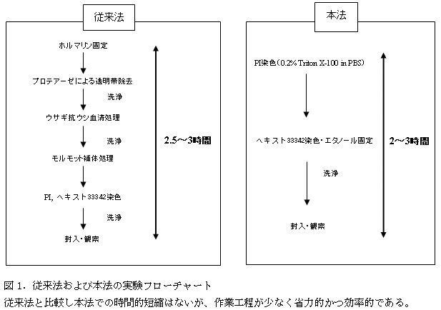 免疫染色法を用いる従来法と比較し、作業工程数が非常に少ない(図1)。