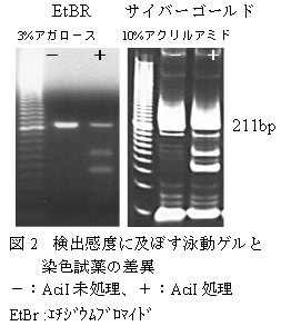 AciI制限酵素消化後の小断片の解析には10%ポリアクリルアミドを使用して電気泳動し、DNA染色にはサイバーゴールドを使用することにより感度の高い解析ができる。(図2)。