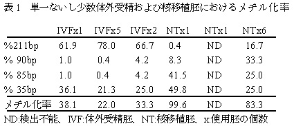 表1 単一ないし少数体外受精および核移植胚におけるメチル化率