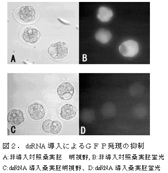 - GFP遺伝子に対する二本鎖RNAを簡易的に合成し、GFP遺伝子導入マウス初期胚の細胞質内に導入することで特異的に遺伝子発現を抑制することができる。