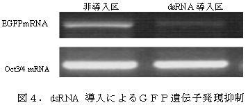 マウス胚に導入されたdsRNAはEGFP遺伝子発現のみを抑制し、内因性遺伝子であるOct3/4発現への影響は及ぼさない(図4)。