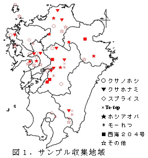 実態調査用に収集したサンプルは2001、2002年(両年とも夏の天候は平年より高温・少雨・多照)に九州各県の農家、普及センターの実証展示圃場、各県試験場の現地試験地から近年育成された飼料イネ専用品種を中心として、生育ステージごとに収集した147点である(図1)。