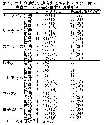 表1 九州各地域で栽培された飼料イネの品種・生育ステージ毎の草丈と穂重割合