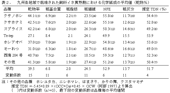表2 九州各地域で栽培された飼料イネ黄熟期における化学組成の平均値(乾物%)