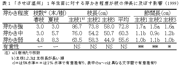 表1 「させぼ温州」1年生苗に対する芽かき程度が枝の伸長に及ぼす影響(1999)