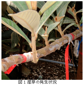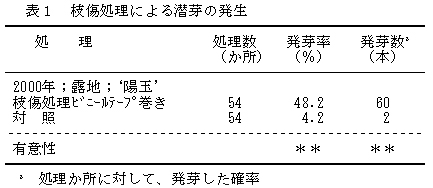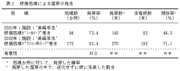 処理後1か月を経過すると発芽が確認でき、施設栽培の「長崎早生」の若木では処理に対し60〜70%が発芽し、パラフィン系資材の接ぎ木テープで巻くと70%の芽が退化せずに順調に生長する(表1、表2)。露地栽培の「陽玉」の若木では、処理に対し50%が発芽する(表1)。いずれも潜芽が発生しやすい枝は、枝径が20〜30mm程度である(データ省略)。