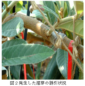 発生した潜芽は、そのまま放置すると直立し徒長的に伸びて花が着生しにくい強勢な枝になるので早い時期(10cm程度の枝長)から図2のように誘引を行う。