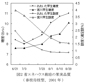 果実品質は、2月21日加温で満開後150日(8月20日)には糖度(Brix)が11、滴定酸が0.9%以下、着色歩合が1〜2分となり、食べやすい食味に仕上がる(図2)。