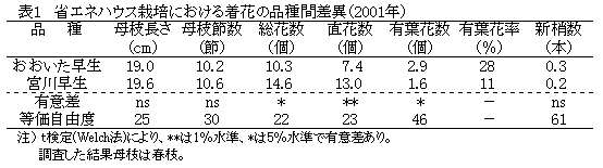 「おおいた早生」の省エネハウス栽培では、「宮川早生」に比べて直花数が少なく、有葉花の割合がやや高いが、着花数に不足はない(表1)。
