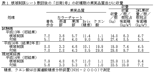 収穫期の果実の着色歩合及び赤道部、果頂部の果皮色は、根域制限シート敷設で良くなる。また、Brix(糖度)は、根域制限シート敷設で明らかに高くなり、クエン酸は、僅かに高くなる傾向がある(表1)。