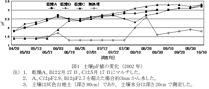 2月にマルチを設置し、深さ20cmの土壌水分は5〜6月をpF2.5、7月をpF2.7、8月〜収穫期をpF2.7〜2.9の乾燥状態で管理する(図1)。