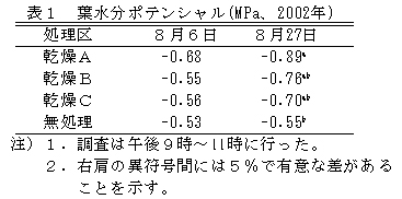 乾燥処理により葉水分ポテンシャルは8月上旬が-0.7MPa、8月下旬が-0.9MPaとなり、無処理の-0.5〜-0.6MPaより低くなる(表1)。