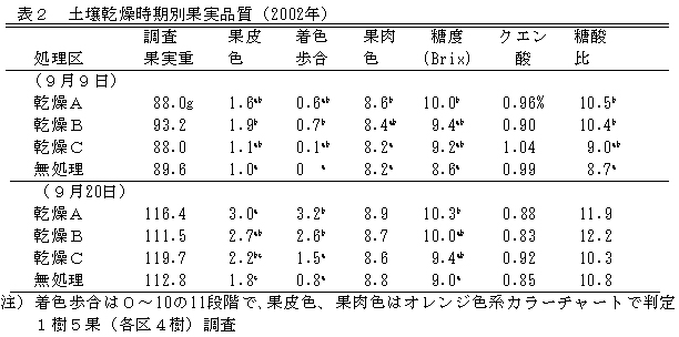 - 「かごしま早生」において、透湿性シートマルチ設置下の土壌水分を5〜6月がpF2.5、7月がpF2.7、8月〜収穫期がpF2.7〜2.9の乾燥状態で管理することにより、9月中〜下旬には糖度10度以上、クエン酸1%以下となり、着色も早くなる。