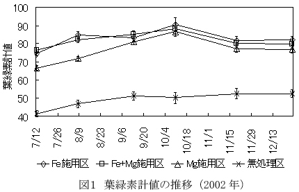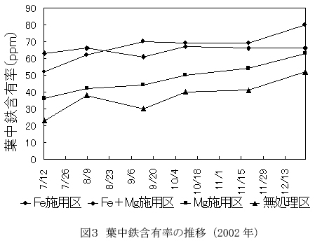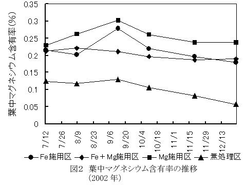 葉中のマグネシウム含有率は7月中旬から9月中旬まで徐々に高くなり、その後低下する(図2)。また、葉中鉄含有率は7月中旬以降徐々に高くなる(図3)。