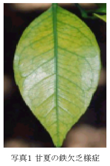鹿児島県出水地域の甘夏で新梢硬化期に新葉の葉脈間が黄化し、葉脈が緑色で網目状となる症状は鉄欠乏の症状に類似しているが、その原因は不明なため、要因解明と対策の確立が望まれている。