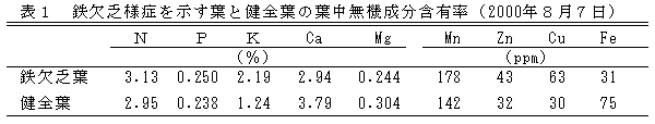 表1 鉄欠乏様症を示す葉と健全葉の葉中無機成分含有率(2000年8月7日)