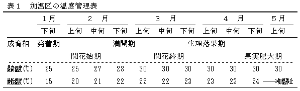 加温区の温度管理は、1月下旬から最低温度を摂氏15度にして加温を開始し、開花期間は摂氏21〜22度、開花終了後〜生理落果期は摂氏23度、果実肥大期は摂氏24度とした(表1)。