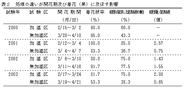 着花枝率及び有核果結果率は、加温区が無加温区よりも高く、無加温区では、年によって着花(果)にバラツキが見られ、結果が安定しない傾向にある(表2)。