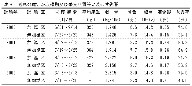 加温に伴う果実肥大促進効果や増収効果が期待できる(表3)。