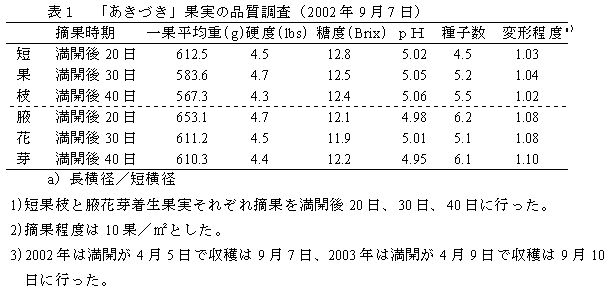 表1 「あきづき」果実の品質調査(2002年9月7日)