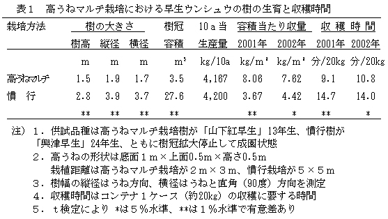 高うねマルチ栽培樹の大きさは、慣行樹に比べて有意に小さく、10a当たり収量は変わらないものの、容積当たり収量は多くなる上、収穫時間は短縮する(表1)。