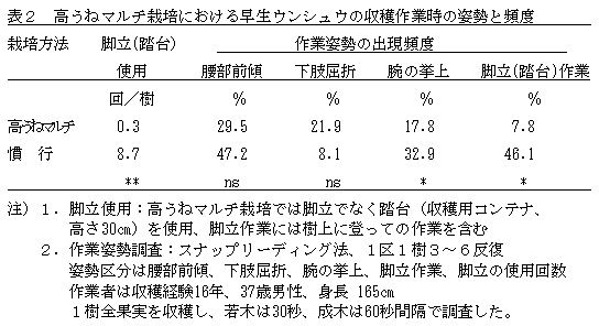 収穫時の作業姿勢は、慣行樹では脚立上での作業が作業時間全体の半分近くを占める上、腕の挙上、腰の前傾等の負担の大きい姿勢の出現頻度が高い。一方、高うねマルチ栽培樹は、腰部前傾、腕の挙上等の出現が低い傾向がある(表2)。