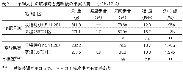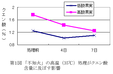 「不知火」を高温(摂氏35度)下におくと、低酸果実区では4日間で19%減酸し、処理4日以降は減酸促進効果が小さい。高酸果実区では、4日間で19%、7日間で28%減酸し、高酸な果実で減酸促進効果が高い(図1、表2)。