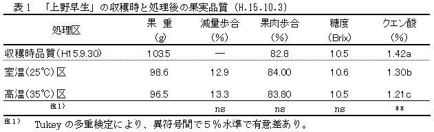 表1 「上野早生」の収穫時と処理後の果実品質(H.15.10.3)