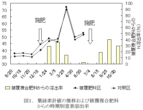 図1 葉緑素計値の推移および被覆複合肥料からの時期別窒素溶出率