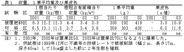表1 収量、1果平均重及び果皮色