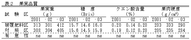 収量、1果平均重及び果皮色は被覆肥料区と対照区の間に差はみられない(表1)。糖度、クエン酸含量及び果肉硬度は被覆肥料区と対照区の間に差はみられない(表2)。