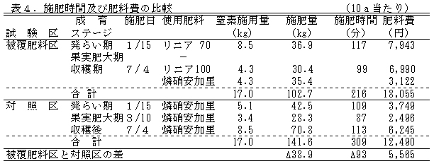 表4 施肥時間及び肥料費の比較(10a当たり)