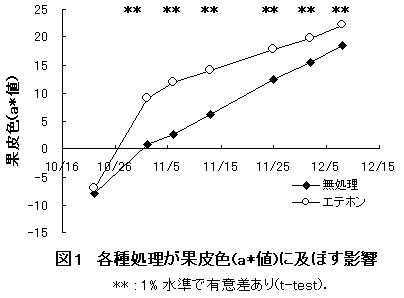 果皮が8分以上着色した時期のエテホン1000倍液(100ppm)およびギ酸カルシウム200倍液の混用散布により、果皮のa*値が増加し着色が向上する(図1、図2)。