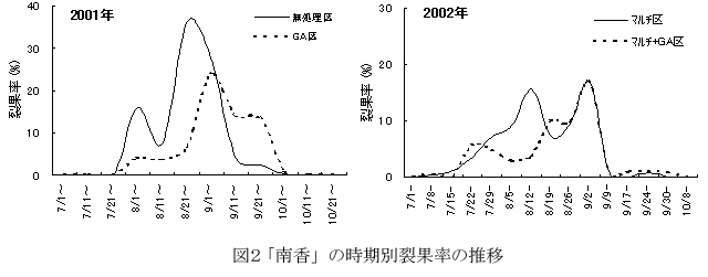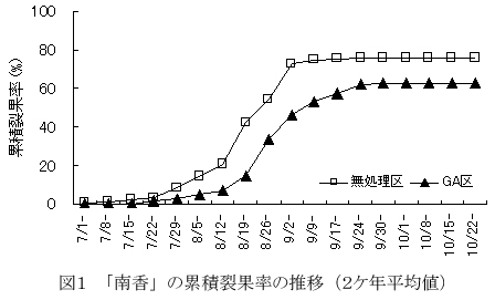 裂果率は、7月下旬〜8月上旬と8月下旬〜9月上旬にピークが見られた。GA区では、7月下旬〜8月上旬の裂果が減少したことから、ジベレリンは、最初の裂果ピークを軽減させるものと思われる(図2)。