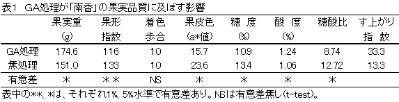 表1 GA処理が「南香」の果実品質に及ぼす影響