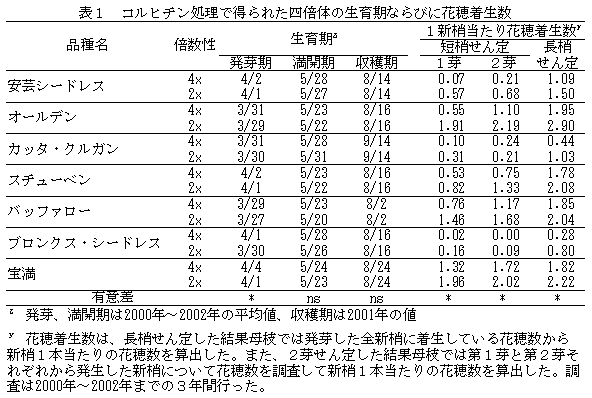 四倍体系統の発芽期は元の二倍体に比較してやや遅くなるが満開期には差がない。花穂着生数は四倍体が元の二倍体品種に比較して明らかに少ない(表1)。