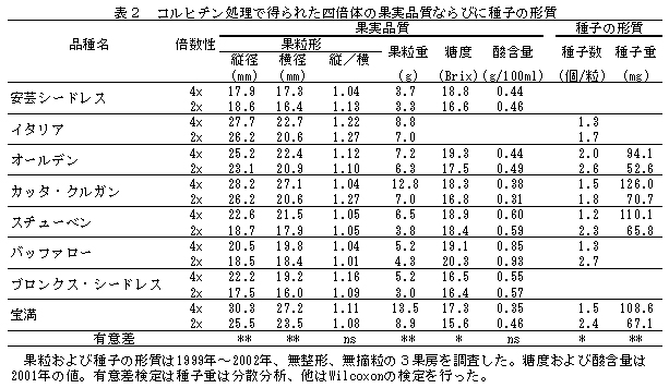 四倍体の果粒は縦径、横径ともに大きく、果粒重も大きくなるが果粒形は変わらない。糖度は四倍体で高くなる傾向であるが、酸含量には差がない。有核品種の四倍体では種子数が減少する一方、種子重が増加する(表2)。