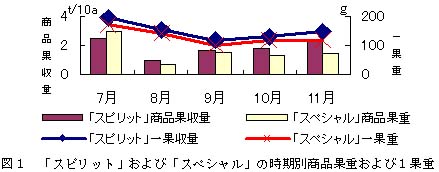 「スピリット」および「スペシャル」の時期別商品果収量は、7月に最も多く、8月に最も少なくなり、その後やや多くなる。また、1果重は、7月に最も重く、9月にかけて減少し、その後やや増加する(図1)。