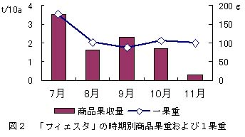 「フィエスタ」の時期別商品果収量は、7月に最も多く8月に減少した後、9月で多くなるが、その後減少する。また、1果重は、7月に最も重く、その後は同等で推移する(図2)。