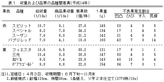 黄色系品種としては、「フィエスタ」が総収量および着果数ともに最も多く、凹凸果およびひび果等障害果の発生が少なくて優れる(表1)。