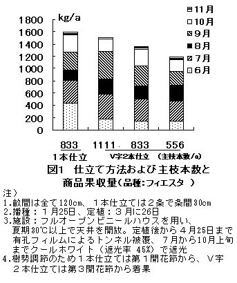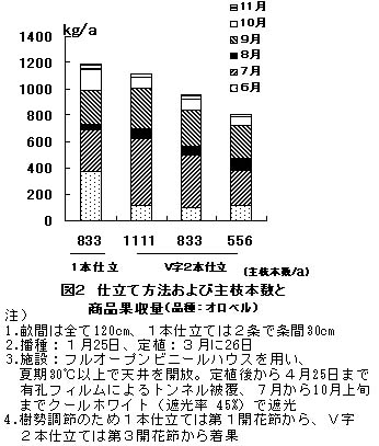 「フィエスタ」、「オロベル」ともに主枝1本仕立て、主枝本数833本/aで最も収量が多くなり、「フィエスタ」では商品果収量は約1.6t/aで、品質も良好である(図1、図2)。