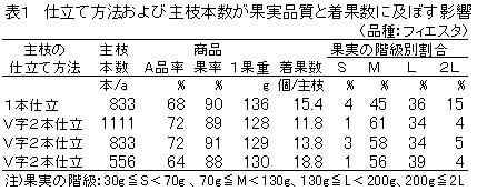 表1 仕立て方法および主枝本数が果実品質と着果数に及ぼす影響(品種:フィエスタ)