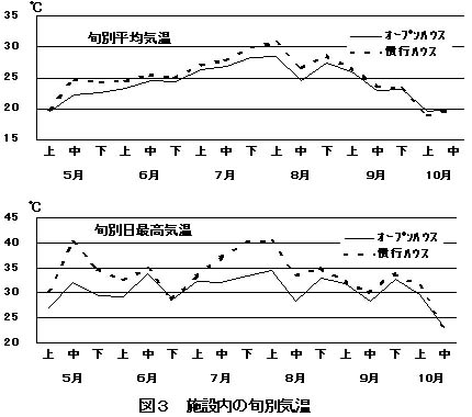 初夏および盛夏季の日最高気温はオープンハウスが慣行ハウスより摂氏5〜8度程度低く、摂氏35度以上になることはない。また、日平均気温も5月中旬から9月上旬までオープンハウスが摂氏1〜2.5度低く摂氏30度を超える日はない(図3)。