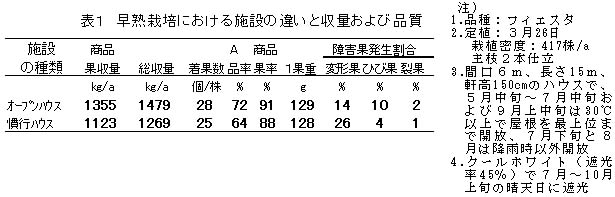 表1 早熟栽培における施設の違いと収量および品質