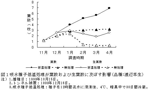 図1 吸水種子低温処理が葉数および生葉数に及ぼす影響(品種:渡辺早生)