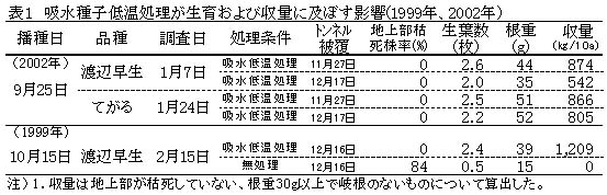 表1 吸水種子低温処理が生育および収量に及ぼす影響(1999年、2002年)
