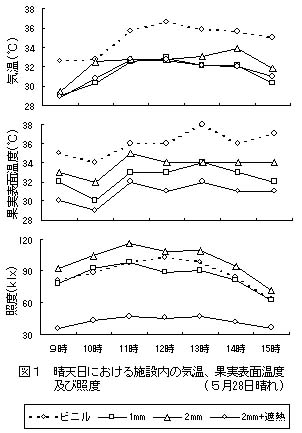 図1 晴天日における施設内の気温、果実表面温度及び照度(5月28日晴れ)