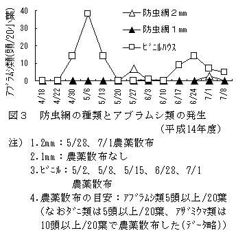 図3 防虫網の種類とアブラムシ類の発生(平成14年度)