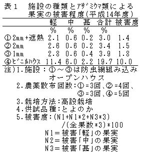 表1 施設の種類とアザミウマ類による果実の被害程度(平成14年度)