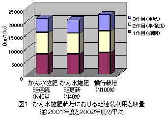 かん水施肥栽培における畦連続利用は慣行栽培の施肥量(35〜37kg/10a/年3作)の約40%でも同程度の収量が得られる(図1)。